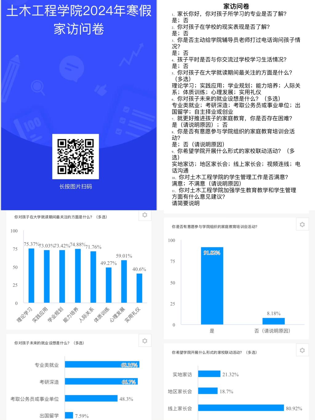 寒假以来,安博官网线上平台土木工程学院多措并举、立体组网,持续推进家校联动工作,充分发挥学院领导班子成员、班主任(学业指导教师)、辅导员等的积极性、主动性和创造性,灵活选取实地走访、网络家访和电话交流等形式,结合各年级学生特点和成长实际分别召开家长会,并围绕课业评估、关注热点、就业指导、满意度测评等内容开展问卷调查,依托精准的数据支撑和贴切的指导帮扶来提升家校教育联动质量。