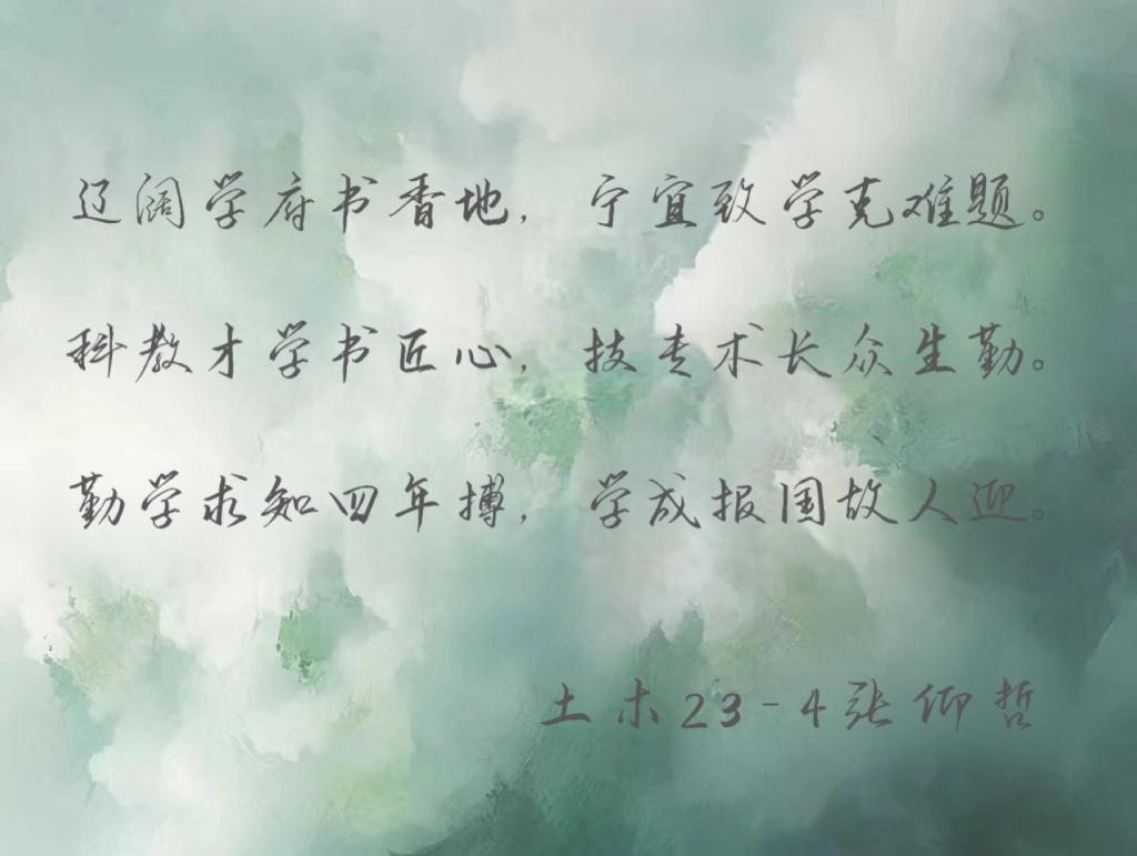 活动开展以来,同学们踊跃报名,共收到作品70余件。“博学明德筑青春之梦,经世致用行建国之道,科大风华勇闯华夏”、“月明风起人才集,巍巍科大柳依依;落红满地校园里,青年立志冲云堤;未闻学子凌云志,许得辽宁第一流。”、“辽阔学府书香地,宁宜致学克难题;科教才学书匠心,技专术长众生勤;勤学求知四年搏,学成报国故人迎。”这些涓涓文字都是辽科大学子对学校的憧憬与礼赞。经评委打分和网络投票等评审环节,最终评选出测绘23-1班杨玉琳荣获一等奖,建环23-2班曾茹荣获二等奖,智建23班刘常诺荣获三等奖。