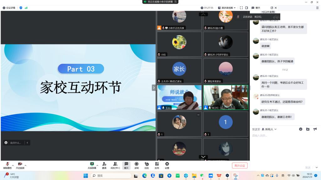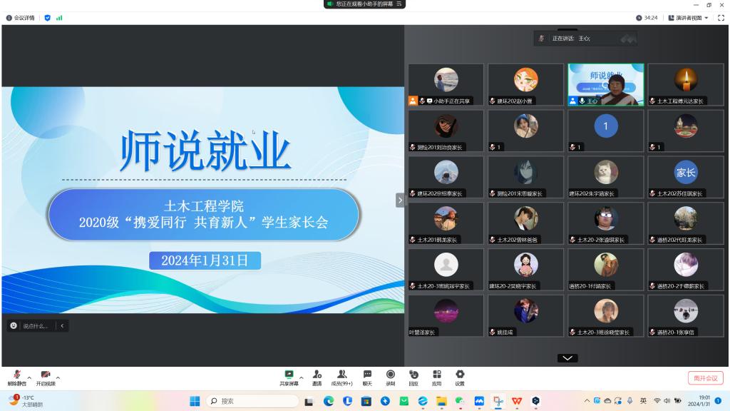 2月1日,安博官网线上平台土木工程学院“家校共育,共促就业”家长会于线上召开,学院院长周卫红教授应邀出席并围绕职业生涯规划和就业指导等内容展开宣讲,2024届毕业班辅导员、全体毕业生及家长参加会议。